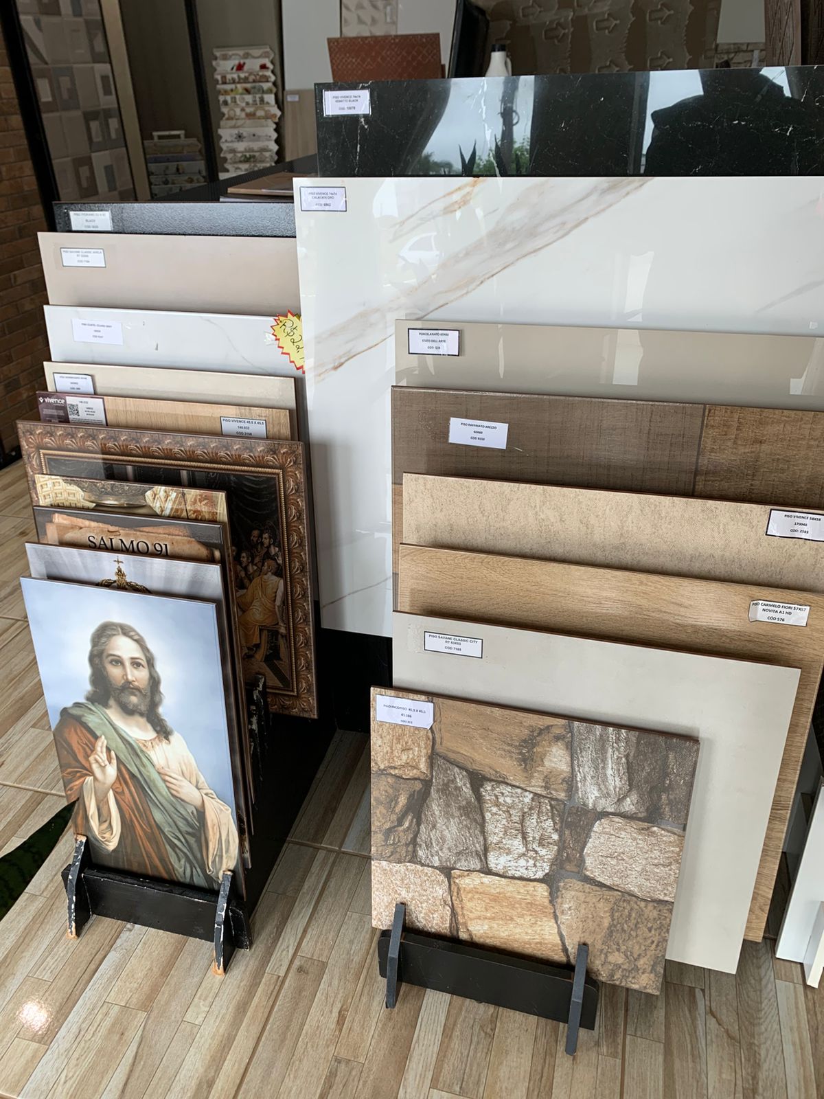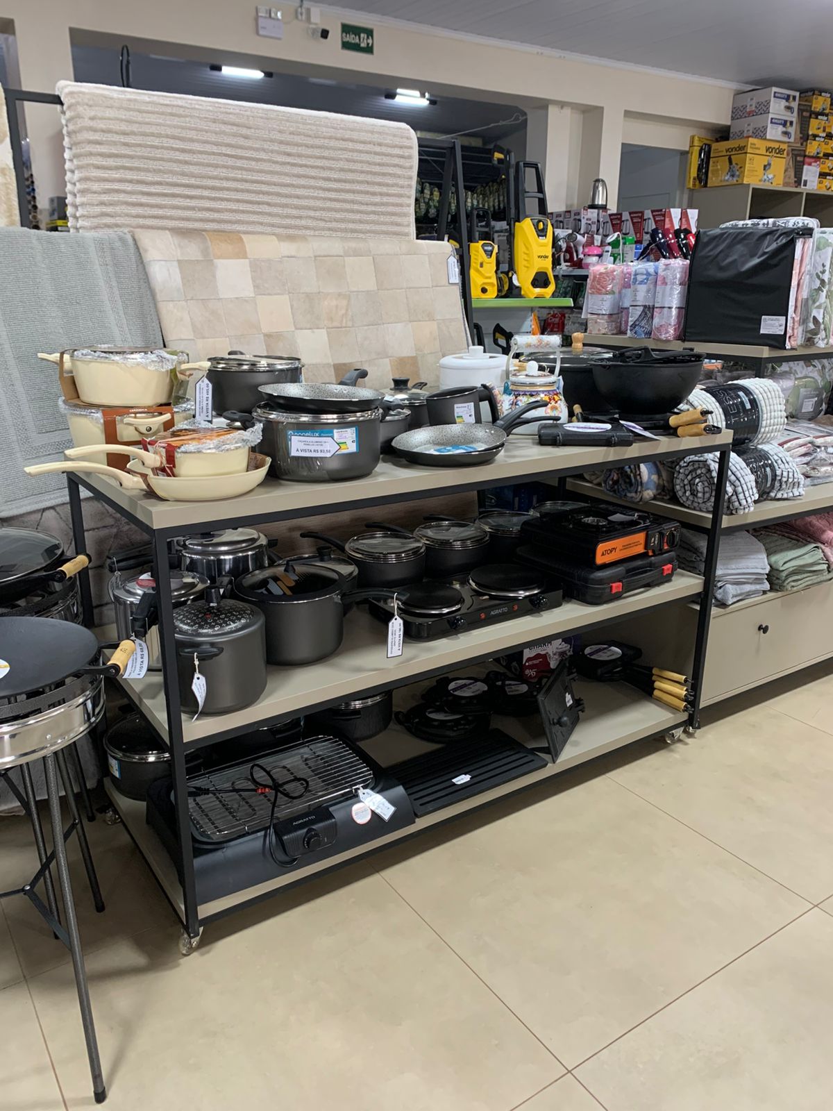 Os descontos variam de 15% a 40% e são identificados por etiquetas coloridas nas peças, por exemplo, a etiqueta verde indicando 40%. Pagamentos à vista e via Pix garantem os percentuais maiores, e há opção de parcelamento em até 10x no cartão sem juros. Para itens específicos como tintas e cerâmicas foram anunciadas condições especiais de parcelamento sem juros e oferta de preço de à vista em até quatro prestações, conforme disponibilidade de estoque.