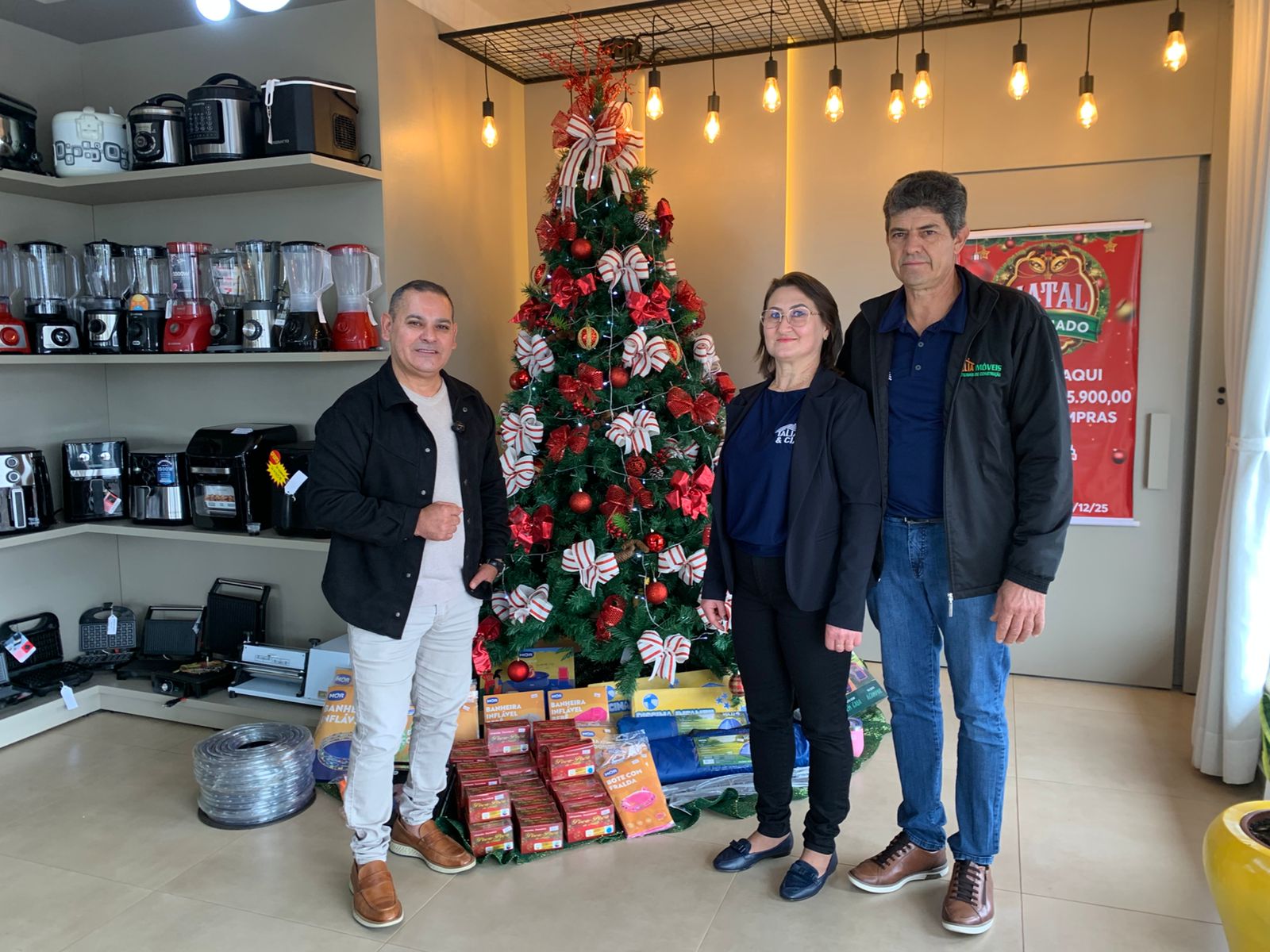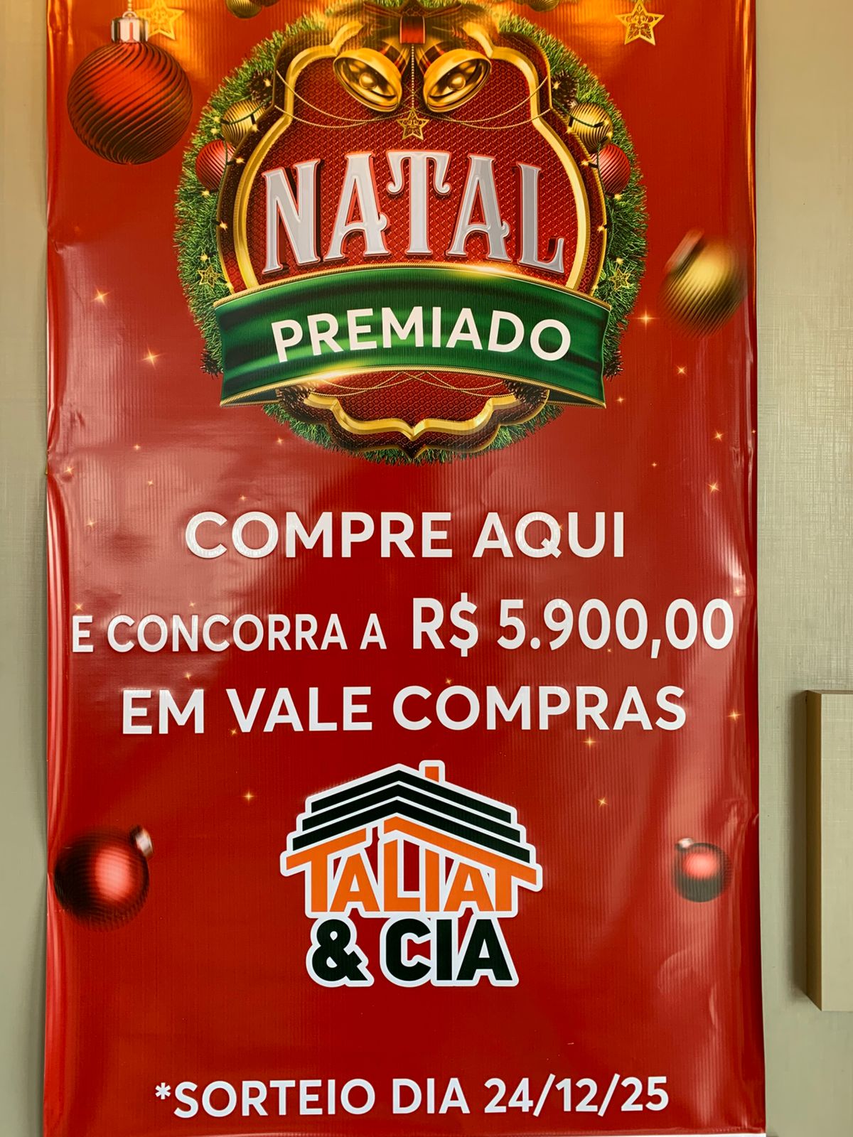 Última atualização: 2025/10/31 10:51:31A Talia & Cia, loja com mais de 30 anos de atuação em Bandeirante, lançou no dia 30 a campanha Natal Premiado. A promoção, divulgada em primeira mão na TVGC, oferece 20 vale-compras que serão sorteados no dia 24 de dezembro, totalizando R$ 5.900 em prêmios. A cada R$ 100 em compras o cliente recebe um cupom para participar, e as premiações variam de R$ 100 a R$ 1.000. A ação já está em vigor e abrange toda a loja.