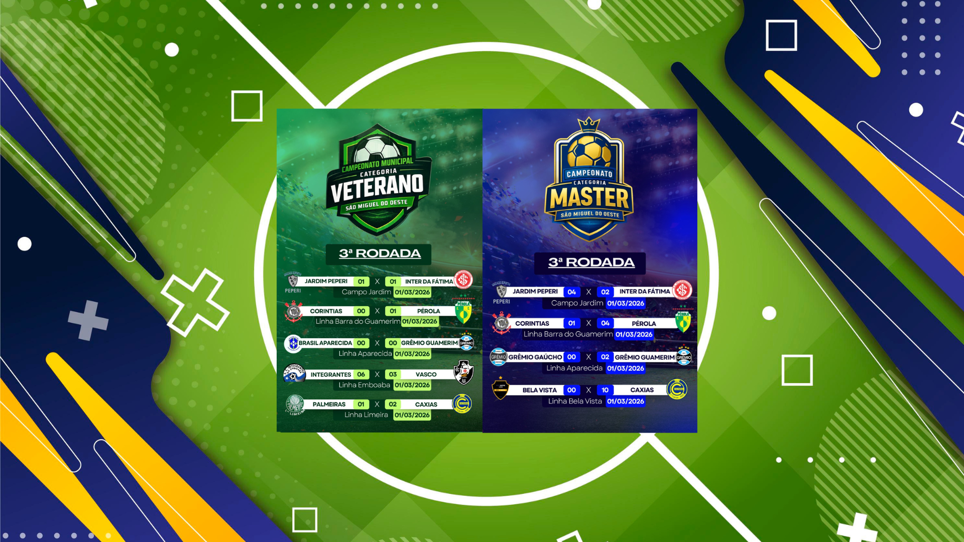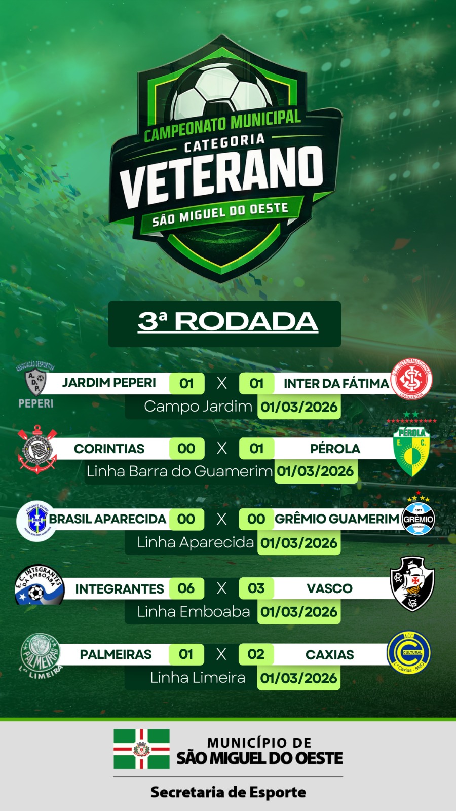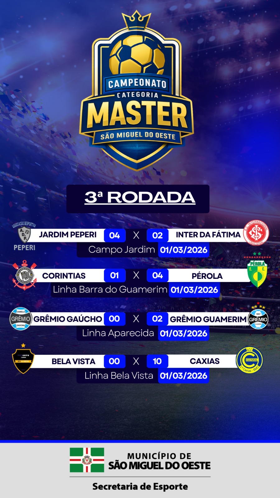 Última atualização: 2026/03/02 3:09:19A 3ª rodada do Campeonato Municipal de Futebol de São Miguel do Oeste, nas categorias Master e Veterano, foi realizada no dia 1º de março de 2026, com partidas disputadas em diversas comunidades do interior do município.