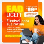 Na nova campanha da instituição, intitulada de EAD UCEFF: Flexível para sua rotina, você tem a possibilidade estudar à distância na UCEFF com matrícula gratuita, primeira mensalidade por R$ 99,00 e até 60% de desconto nas demais mensalidades. Confira o regulamento no site.