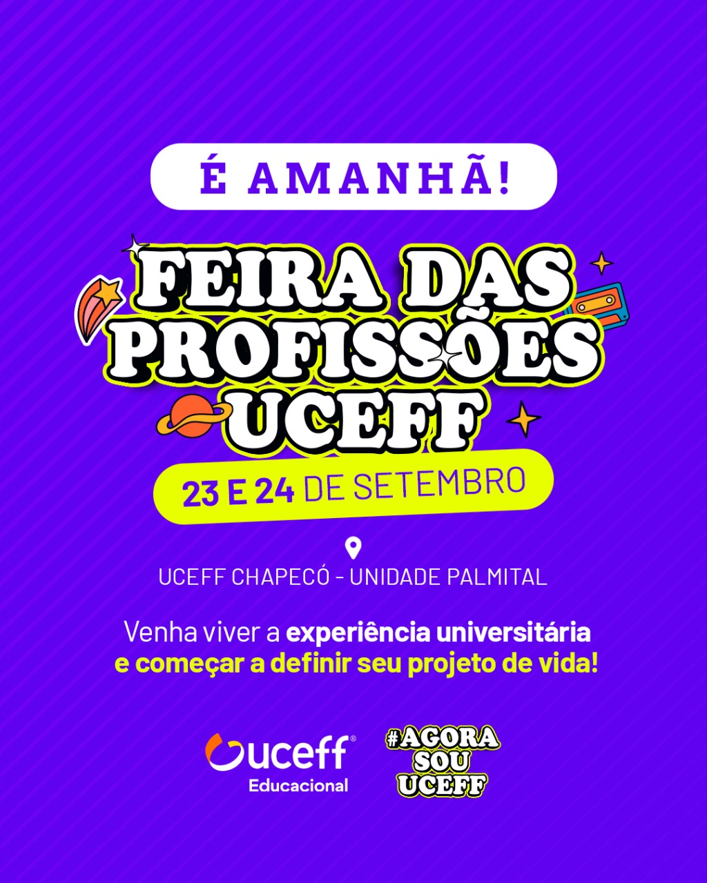 Nesta terça e quarta-feira (23 e 24), ocorrerá na unidade do Palmital da UCEFF Chapecó a edição de 2025 da Feira das Profissões, um evento voltado para a transformação de vidas por meio da formação humana e profissional.