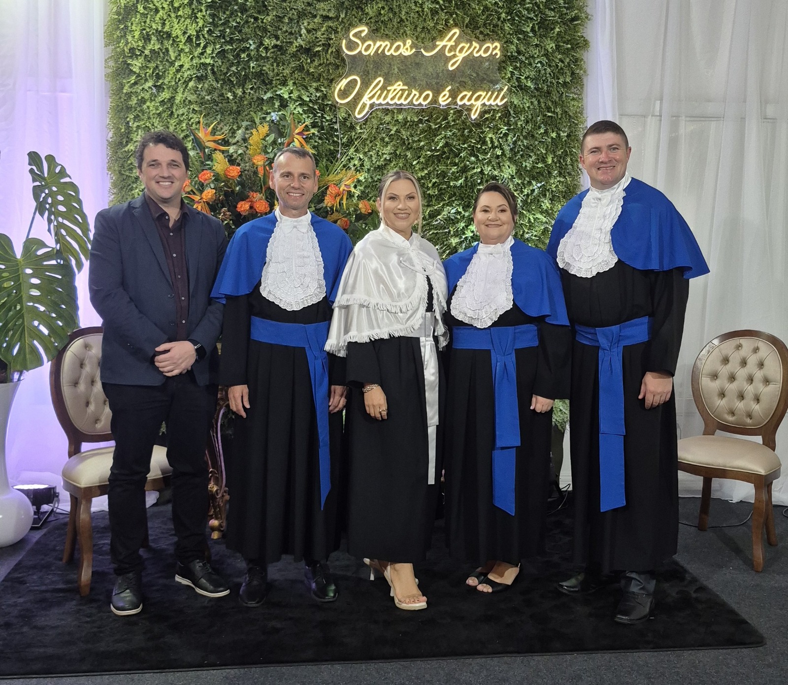 Para compor a mesa diretora dos trabalhos, estiveram presentes a Pró-Reitora da UCEFF, Alexandra Franchini Raffaelli, o coordenador do curso de Agronomia e paraninfo da turma, professor Neuri Feldmann, o patrono da turma, professor Anderson Clayton Rhoden, a professora amiga da turma, Fabiana Raquel Mühl, e o representante do CREA-SC, Douglas Cesar Patel.