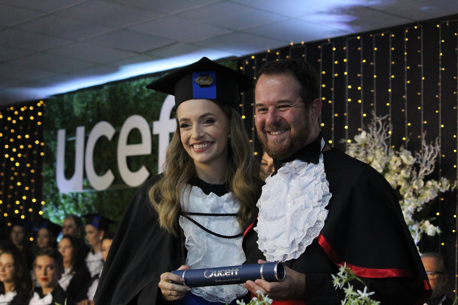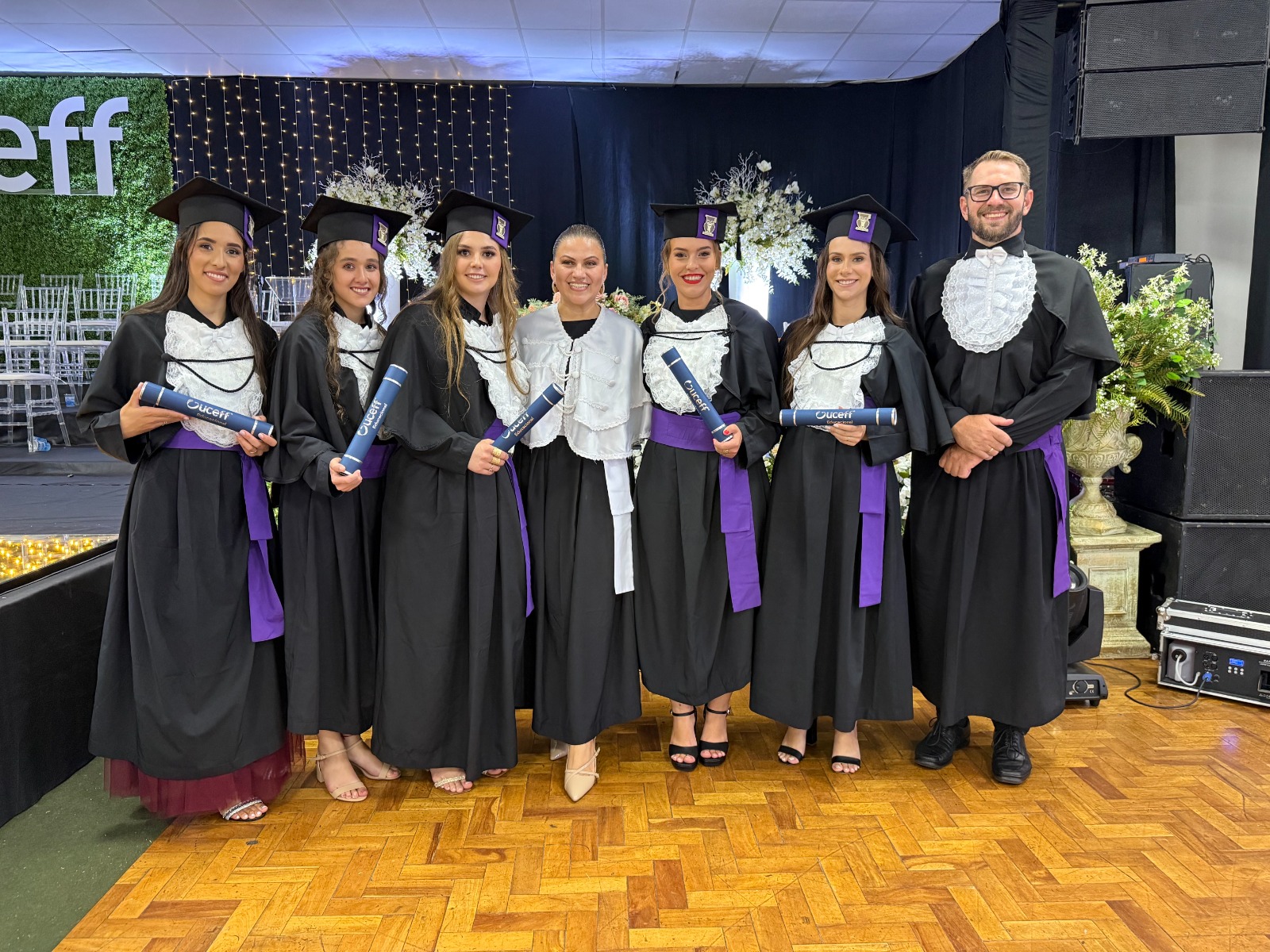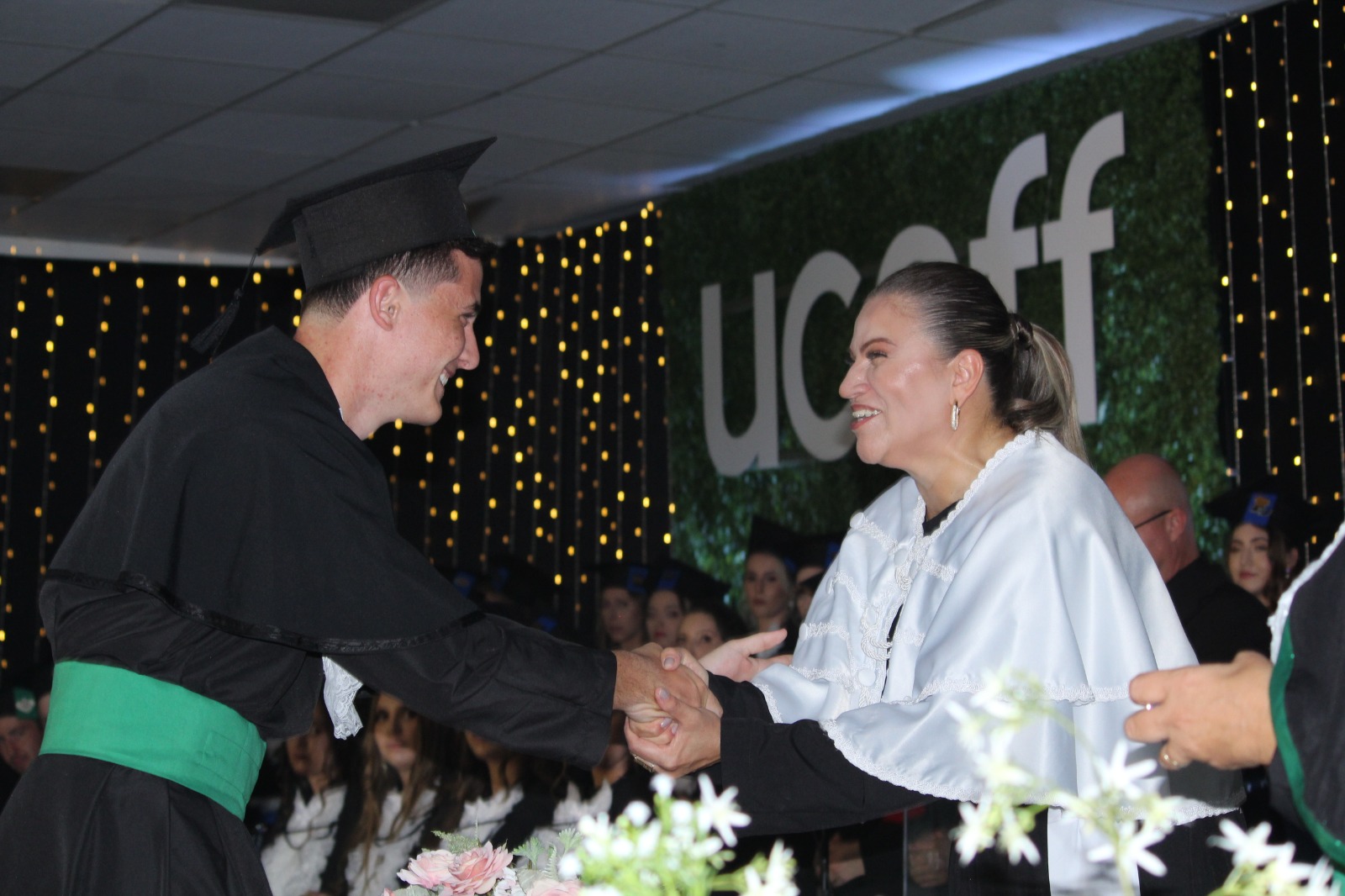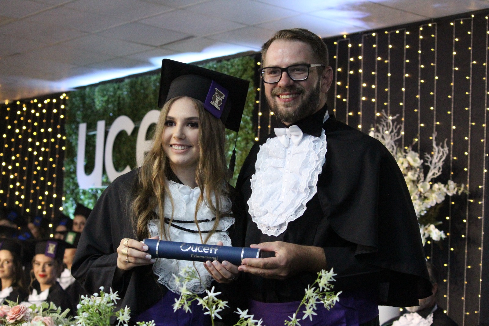 “É com grande honra que hoje, na condição de Pró-Reitora da UCEFF, participo deste momento solene que marca o início de uma nova fase na vida dos nossos graduandos. A partir deste momento, vocês serão nossos maiores exemplos e também referência para aqueles que começam a trilhar o mesmo caminho. Sigam firmes, éticos e comprometidos nas diferentes áreas que vocês escolheram estar. Obrigado aos pais por confiarem na instituição e parabéns aos formados por essa conquista! A UCEFF sempre será a casa de vocês.”, disse a Pró-Reitora da UCEFF em seu discurso de encerramento.