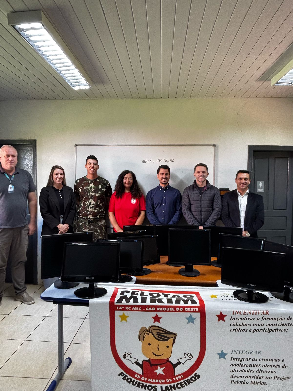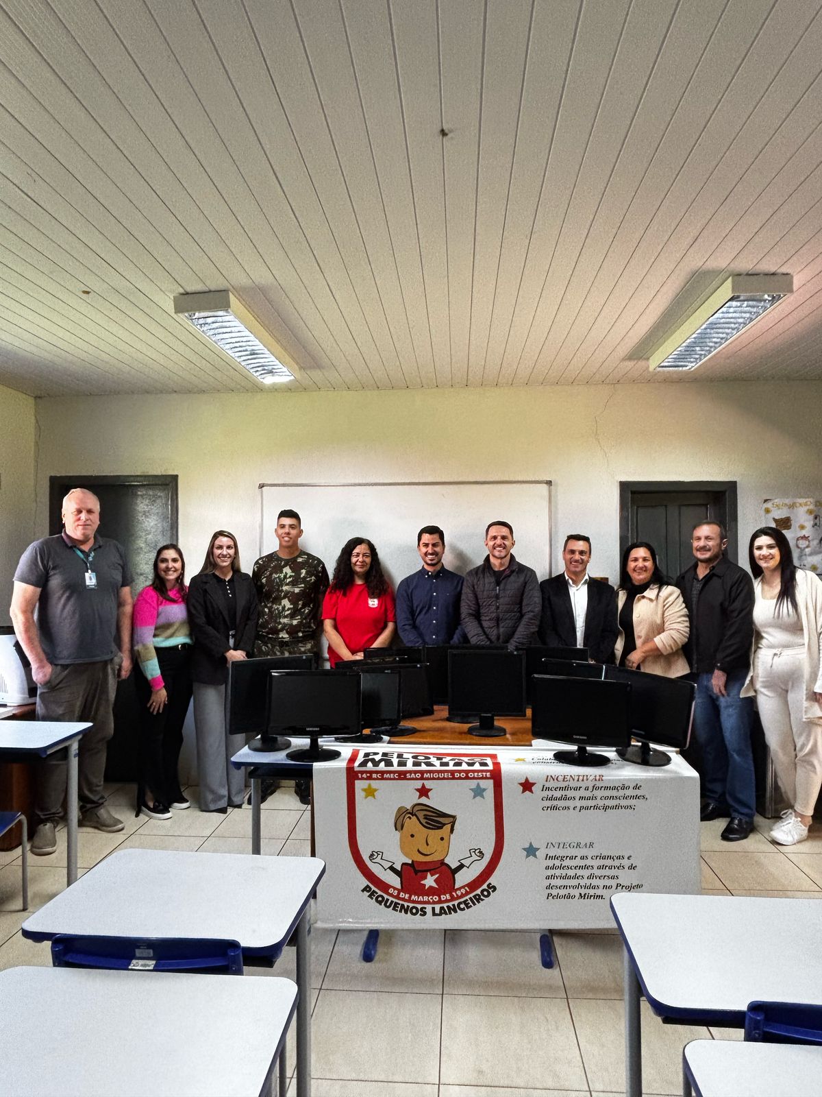 Última atualização: 2025/05/01 10:33:46Um gesto de solidariedade e compromisso com o futuro mobilizou lideranças de São Miguel do Oeste na manhã desta quarta-feira (30). A Câmara de Dirigentes Lojistas (CDL), o Sicoob São Miguel e os vereadores Andréia Rebelato e Sandro Zancanaro uniram forças para beneficiar o projeto Pelotão Mirim, com a doação de 11 computadores que serão usados na formação educacional e cidadã de crianças e adolescentes atendidos pelo programa.