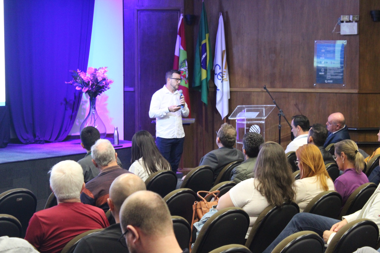 As duas primeiras palestras foram ministradas por profissionais da Celesc. O engenheiro Marco Aurélio Gianesini, gerente da Unidade de Coordenação ADMS/WFM (UCPA), falou sobre o Corredor Elétrico Catarinense, apresentando os 34 pontos de recarga rápida já instalados no estado e os projetos futuros para a instalação de mais 20 estações. O engenheiro Ayslan de Souza Ferreira, gerente da Divisão de Geração Distribuída (DPGT/DVGT), detalhou o papel da Celesc no carregamento de carros elétricos em condomínios.